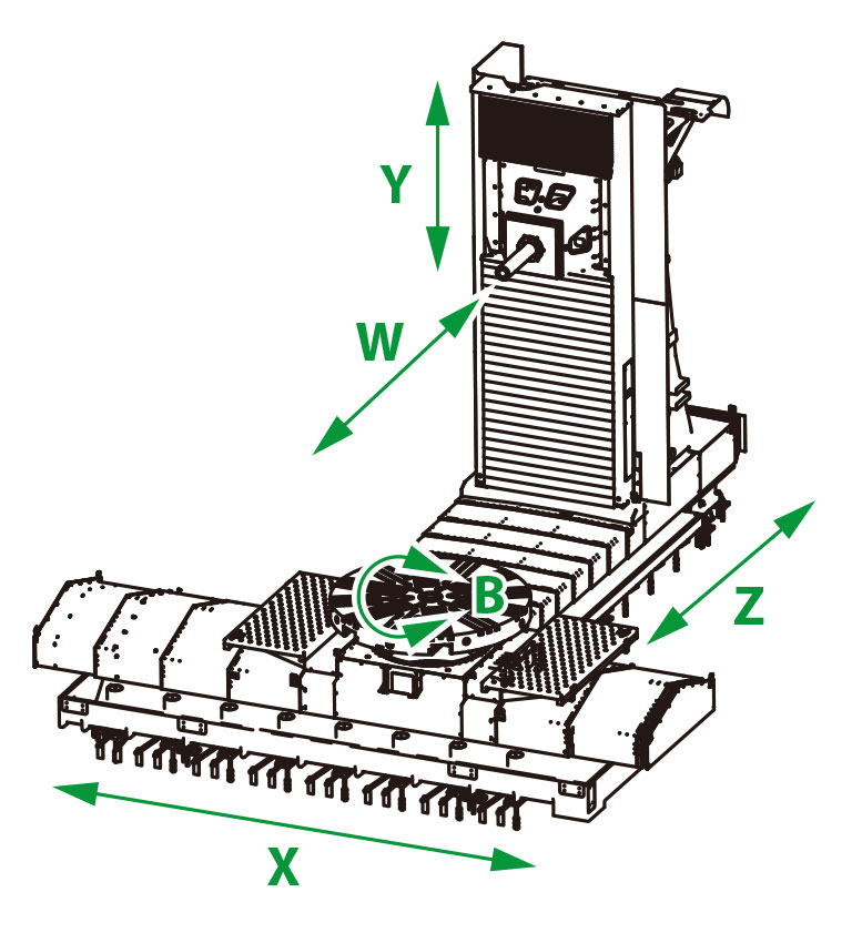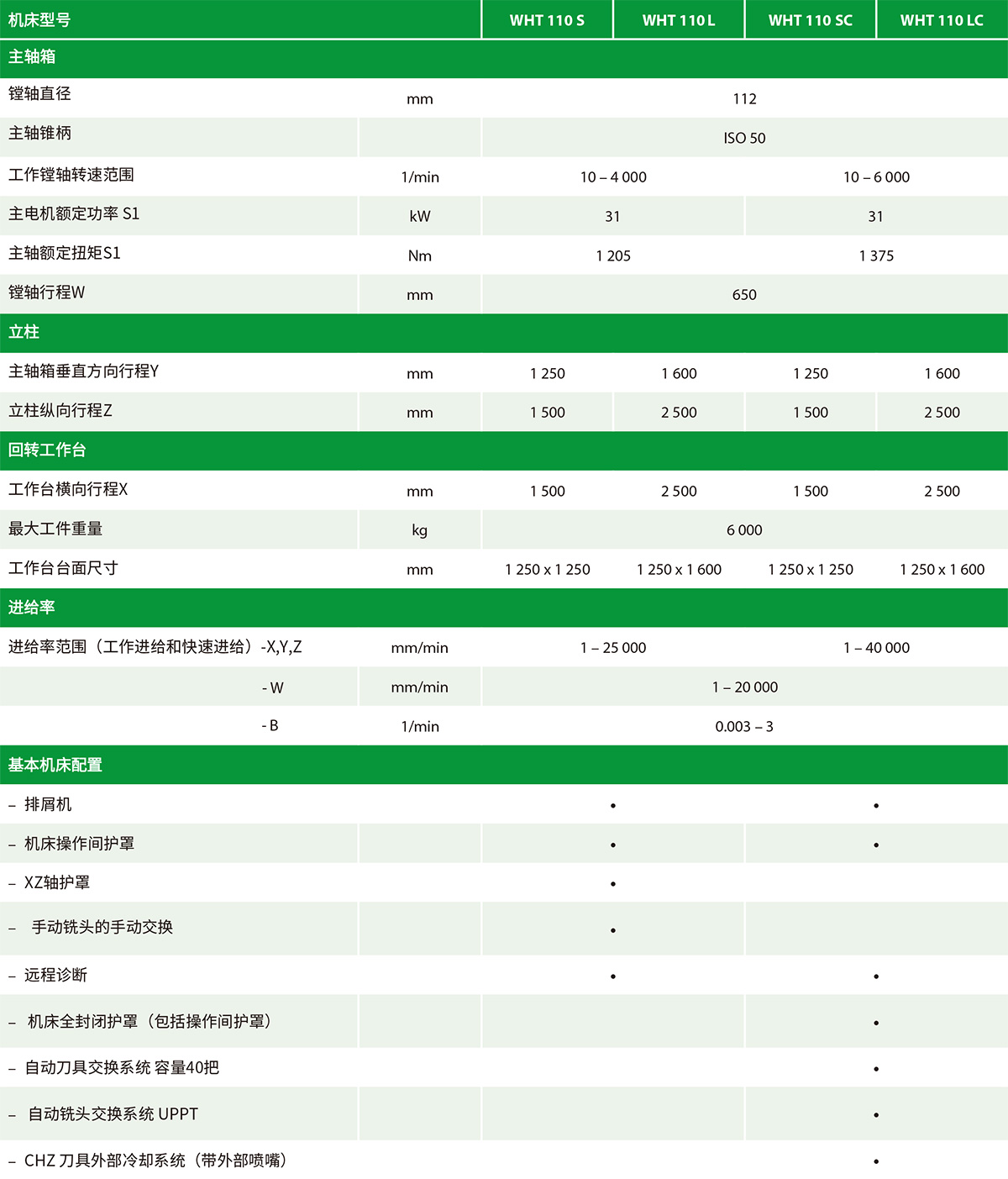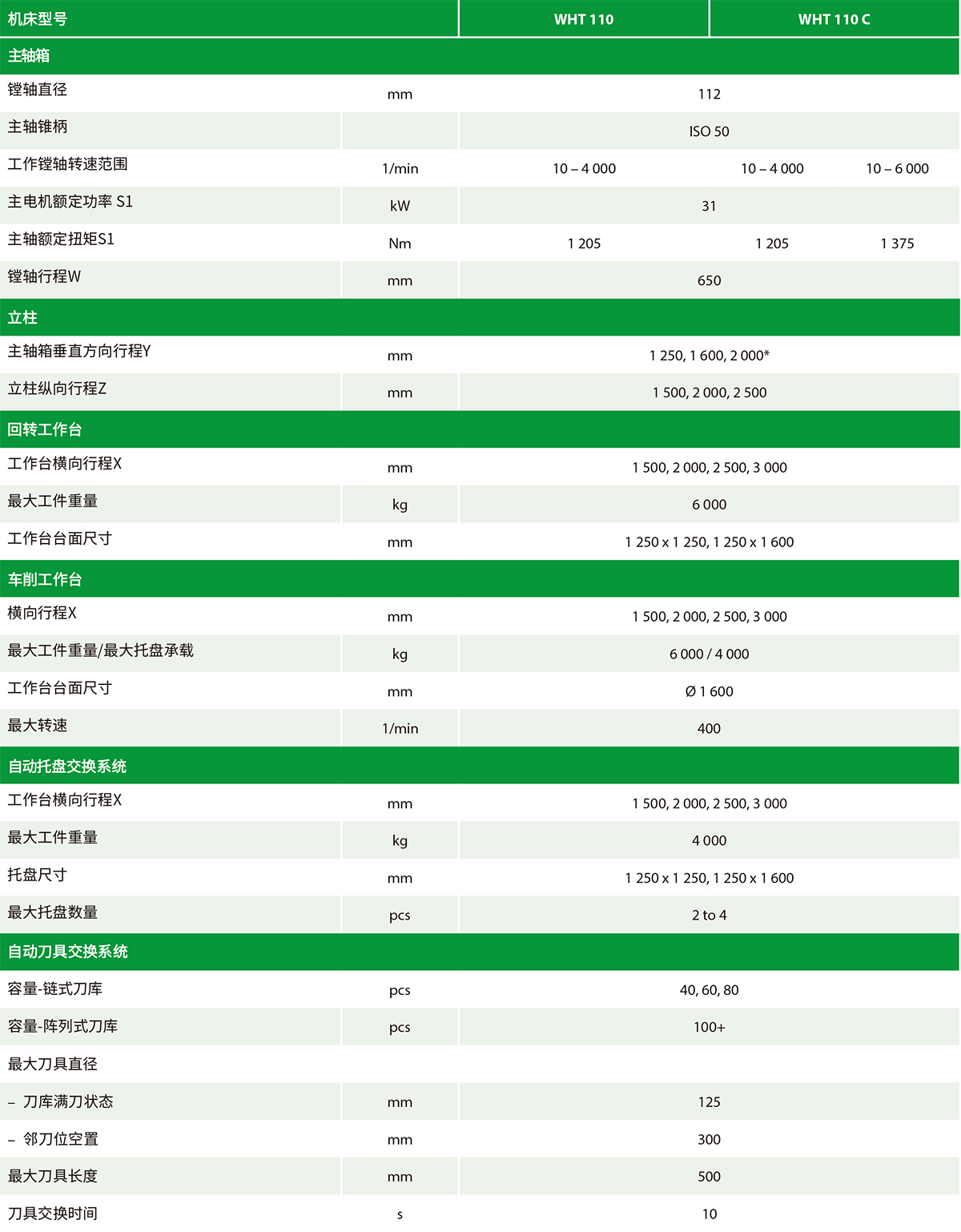 - WHT 110/130L - 大規(guī)格版本,帶回轉(zhuǎn)工作臺(tái),工作鏜軸的轉(zhuǎn)速為≤4000rpm/min。