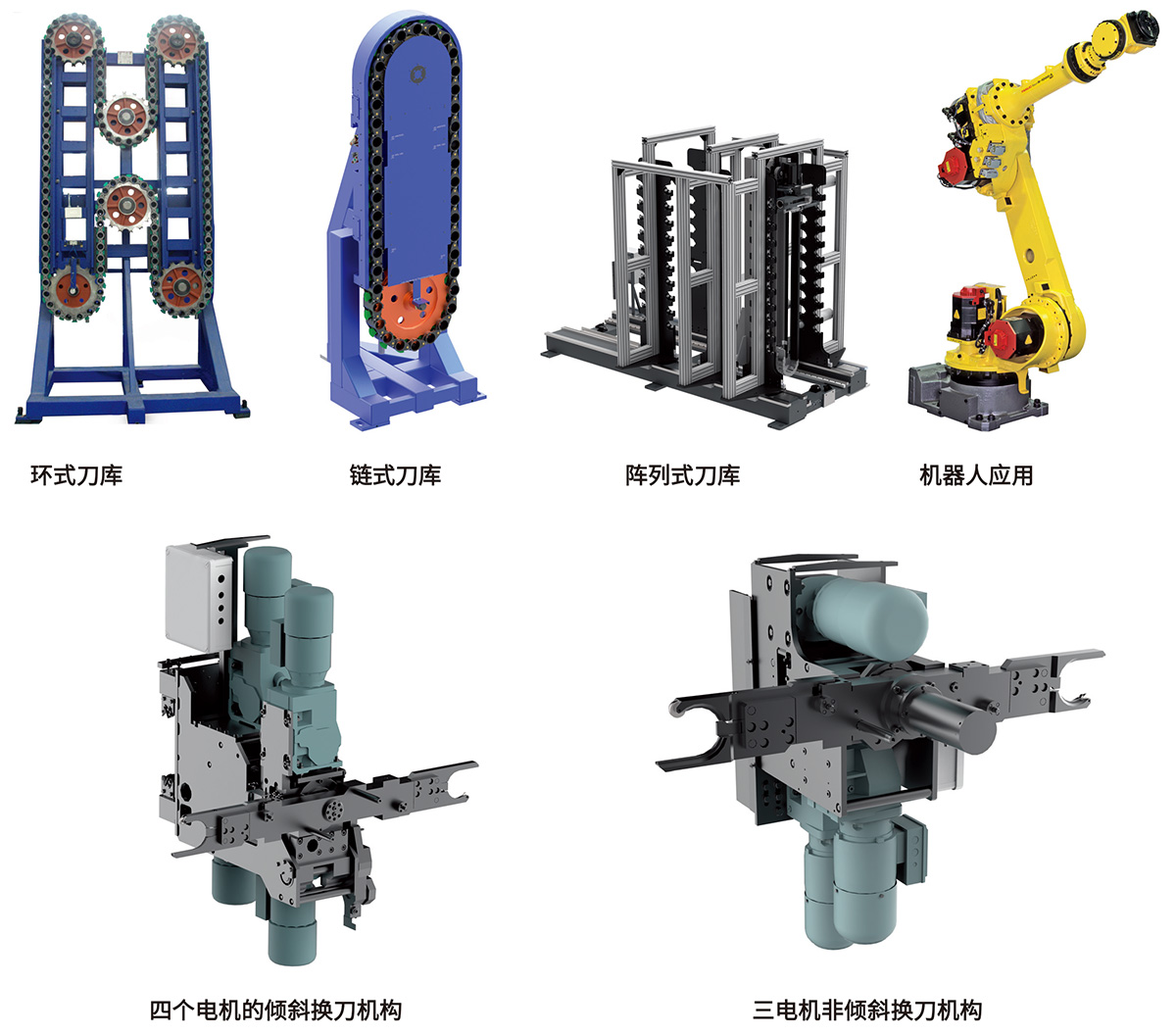 包括鏈式刀庫和陣列式刀庫,換刀臂在立柱上或者刀庫上配置雙換刀臂。刀具選擇根據(jù)刀庫中的編號。